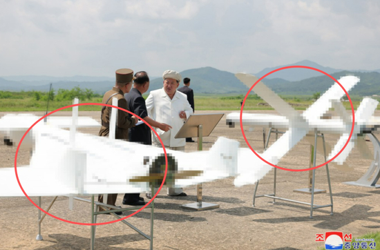 另外一款无人机的照片不是很清晰,但有分析认为,这很可能是2024年8月出现在朝中社新闻图片中左边的那款。由于这款无人机形似鳐鱼,所以看上去与以色列制造的自杀式无人攻击机“哈洛普(HAROP)”外形有些相似。