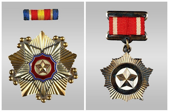 中国人民革命军事博物馆藏彭德怀司令员荣获的朝鲜一级国旗勋章与金星奖章。