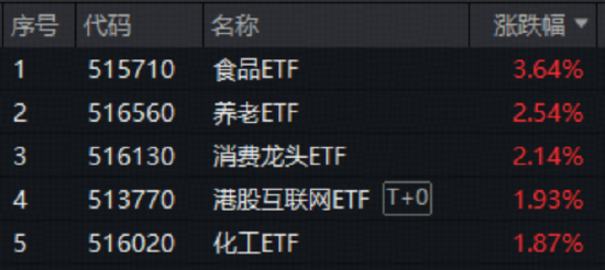 盘面上,大消费概念全线爆发,“茅五泸汾洋”白酒集体猛攻,食品ETF(515710)场内价格猛拉3.64%,收盘涨幅霸居全市场ETF第八;养老ETF(516560)场内价格拉升2.54%,此前5日连续获资金净流入;消费龙头ETF(516130)场内价格劲涨2.14%,一举收复5日、10日、20日、60日四根均线。
