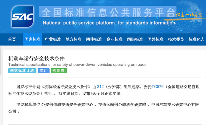 11月12日,据全国标准信息公共服务平台官网,公安部组织起草的国家标准计划《机动车运行安全技术条件》向社会征求意见。该标准主要起草单位有公安部道路交通安全研究中心、交通运输部公路科学研究院、中国汽车技术研究中心有限公司,拟在征求意见稿发布后6个月正式实施,替代现行的GB 7258。
