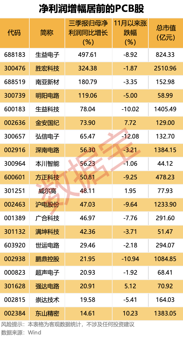 具体来看,前三季度4家上市公司扭亏为盈;2家减亏;27家归母净利润实现同比增长,报喜比例达到75%。生益电子、胜宏科技、南亚新材、明阳电路归母净利润同比增幅居前,均超过100%。