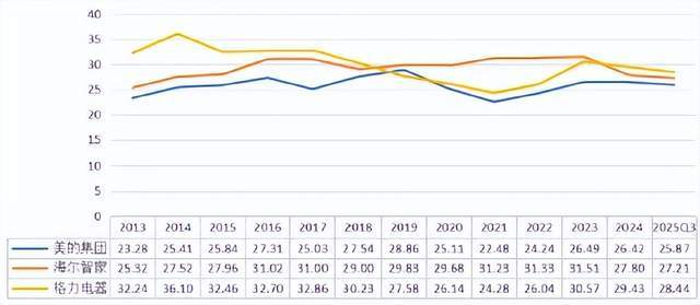 美的、海尔、格力近年来毛利率变化;数据来自Wind