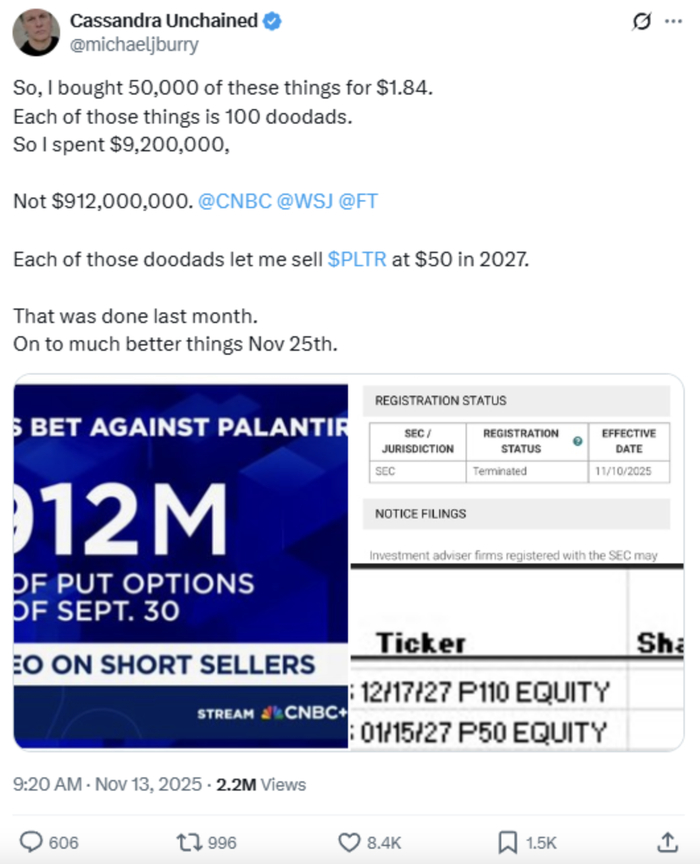 Michael Burry在社交平台X上贴出截图,引用了美国消费者新闻与商业频道(CNBC)的一条报道标题:“Michael Burry持有价值9.12亿美元的Palantir看跌期权。”