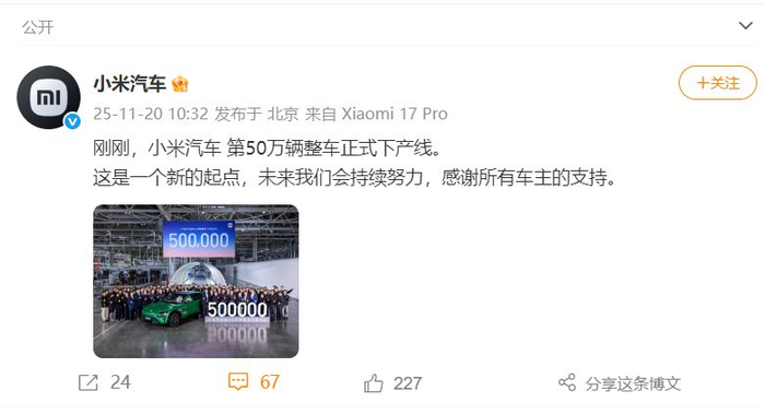11月20日,小米汽车官方微博发文称第50万辆整车正式下产线。小米汽车称,这是一个新的起点,未来我们会持续努力,感谢所有车主的支持。