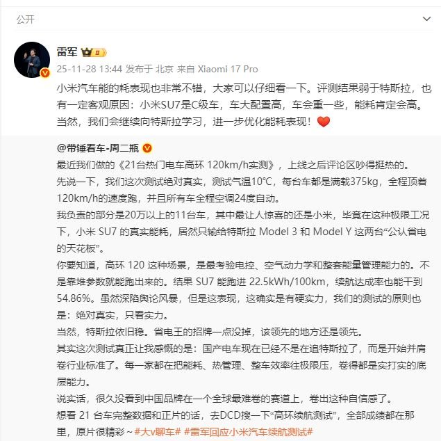 28日,雷军发微博称:小米汽车的能耗表现也非常不错,大家可以仔细看一下。评测结果弱于特斯拉,也有一定客观原因:小米SU7是C级车,车大配置高,车会重一些,能耗肯定会高。当然,我们会继续向特斯拉学习,进一步优化能耗表现。