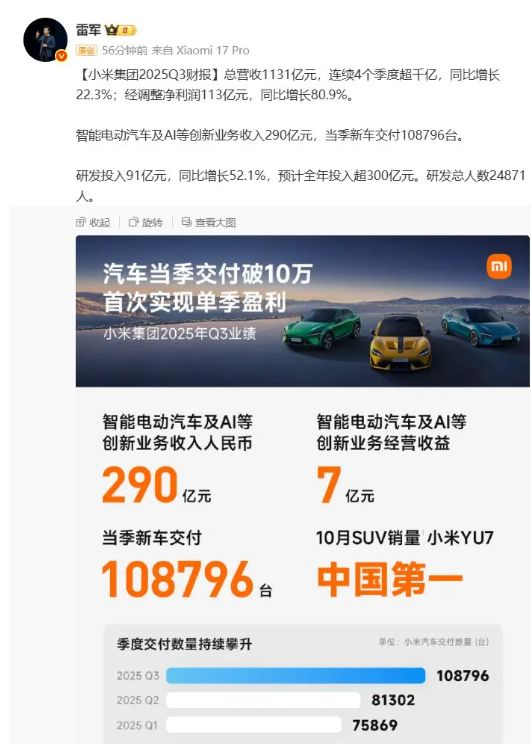 11月18日,小米集团(01810.HK)发布业绩公告显示,2025年第三季度实现营收约1131.21亿元,同比增长22.3%,连续4个季度突破千亿元;经调整净利润为113亿元,创历史新高,同比增长80.9%。