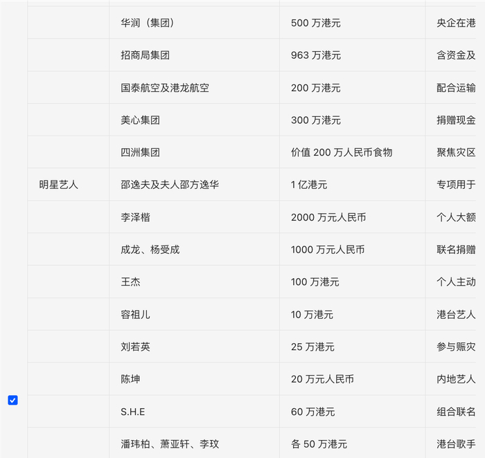 汶川地震香港各界总捐款超 200 亿港元,95% 的港人参与捐款,彰显同胞深情, 长江水灾等我们也看到香港同胞的捐款,如今,香港遭灾,是大陆企业和明星回报的时候了!