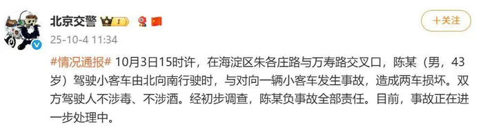2025年10月3日下午,有网友曝出图片,称车评人陈震发生交通事故。北京市交管部门于10月4日通报,事故双方均未涉酒涉毒,陈某负事故全部责任。