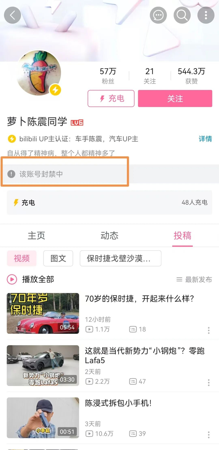 陈震B站账号主页显示,该账号封禁中。
