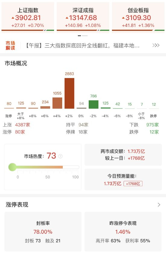 财联社12月5日电,市场探底回升,创业板指涨超1%,早盘一度跌超0.5%。沪深两市成交额1.73万亿,较上一个交易日放量1768亿。盘面上,市场热点轮番活跃,全市场近4400只个股上涨。从板块来看,福建板块持续爆发,海欣食品8天7板,厦门港务、太阳电缆等10余股涨停。大金融板块大幅拉升,瑞达期货、中银证券涨停,赢时胜20cm涨停。商业航天概念反复活跃,顺灏股份6天5板,龙洲股份3连板。可控核聚变概念表现强势,国机重装、宝胜股份涨停。下跌方面,医药板块表现疲软,广济药业、粤万年青下挫。板块方面,保险、贵金属、福建、商业航天等板块涨幅居前,银行、中药、影视院线等板块跌幅居前。截至收盘,沪指涨0.7%,深成指涨1.08%,创业板指涨1.36%。