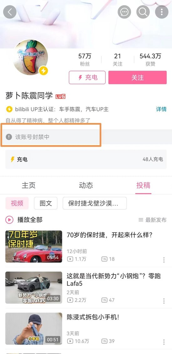 值得注意的是,12月4日深夜,知名车评人陈震多个社交媒体平台账号被禁言。此前,其开劳斯莱斯闪灵出车祸被通报,近期有言论引质疑。