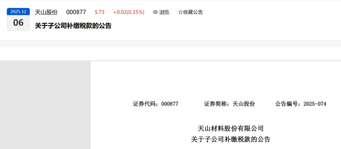 天山材料股份有限公司(简称“公司”)子公司根据企业自查情况,需补缴税款及滞纳金共计约6,185.58万元。截至本公告披露日,子公司已将上述税款及滞纳金缴纳完毕,本次涉税事项不涉及行政处罚。