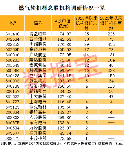 在行业高景气的背景下,燃气轮机概念股频繁获得机构调研。据数据宝统计,截至12月12日,年内共9只概念股获机构调研10次及以上。博盈特焊、西子洁能、杰瑞股份、豪迈科技、广联航空获调研频次靠前。