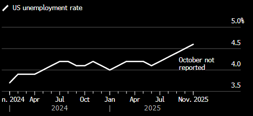由于美国政府停摆的持续时间创出纪录,劳工统计局取消了10月非农报告的发布,将该月数据合并至11月报告一并发布。虽然该统计局无法通过追溯性家庭调查得出10月失业率,但根据许多企业独立在线申报的另一项调查得出了非农就业数据。