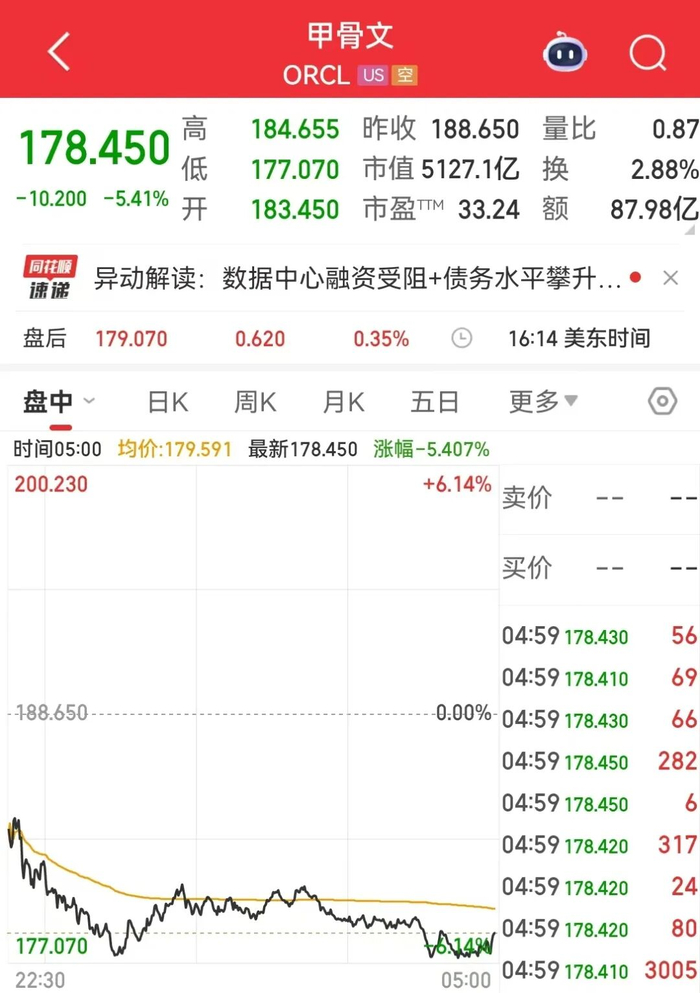 甲骨文跌超5%。甲骨文公司在该公司雄心勃勃的人工智能(AI)基础设施扩张计划上遭遇重大挫折,其最大的数据中心合作伙伴Blue Owl Capital已决定不再支持一项价值100亿美元的数据中心项目。不过,甲骨文随后回应称,该项目的谈判仍然按计划进行,整体推进情况符合预期,且交易中不包括蓝猫头鹰资本。