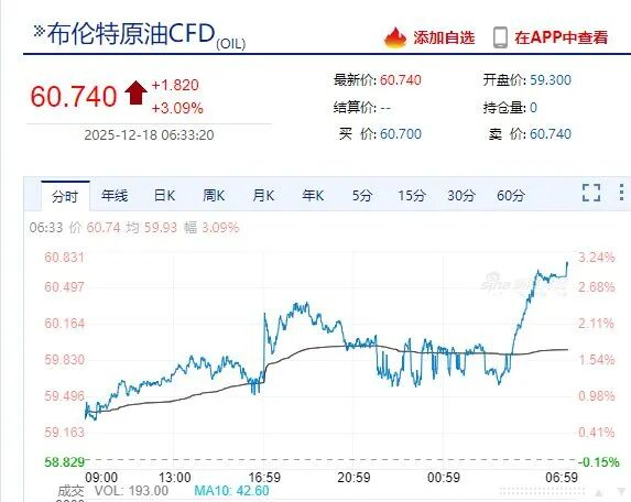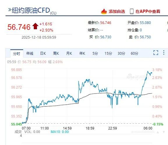 据央视新闻,当地时间12月16日,美国总统特朗普称,他当天下令全面封锁所有进出委内瑞拉的受制裁油轮。持续的地缘政治风险以及强劲的需求共同推动贵金属走高。WTI原油期货涨幅扩大至3%,报56.8美元/桶。现货黄金收涨0.88%,报4339.94美元/盎司。白银时隔两个交易日再创盘中历史新高,纽约期银一度涨超6%。