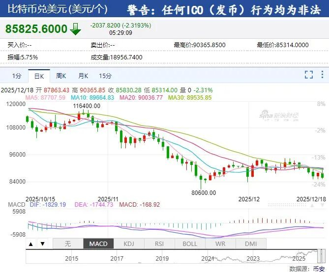 此外,比特币向下跌破86000美元,过去24小时内下跌超2%。