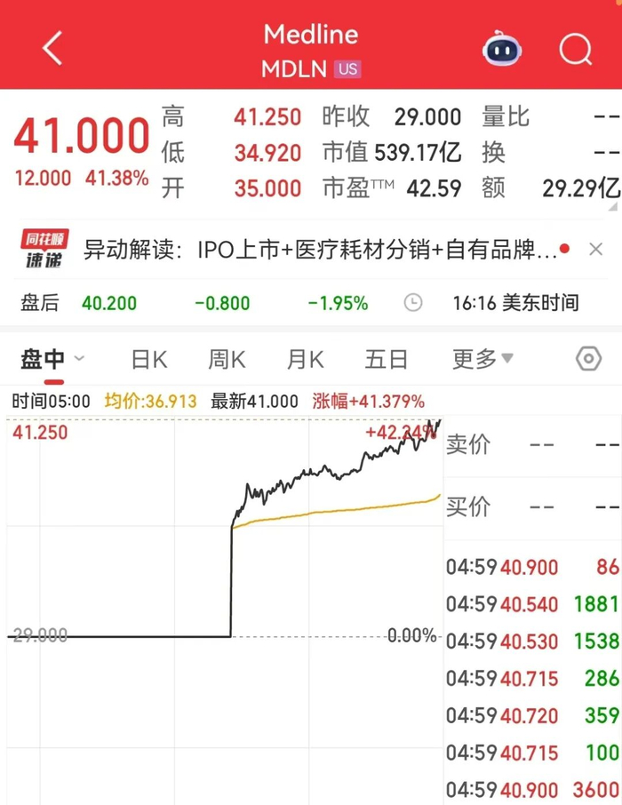 2025年最大规模IPO:Medline Inc.(MDLN)美国IPO首日涨41.38%,报41美元,此前给出的IPO发行价为29美元,融资62.6亿美元。
