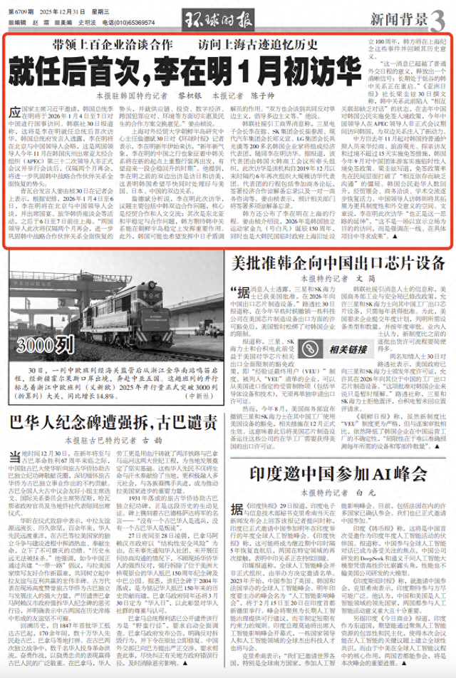 上海对外经贸大学朝鲜半岛研究中心主任詹德斌30日对《环球时报》记者表示,李在明新年伊始来访,“新年新气象,李在明的中国之行也象征着中韩关系将在新的起点上重整行装再出发,有望迎来一段企稳回升的时期”。他提到,李在明之前的双边出访是访日和访美,这表明韩国希望尽快同时处理好与美国、日本、中国的双边关系。