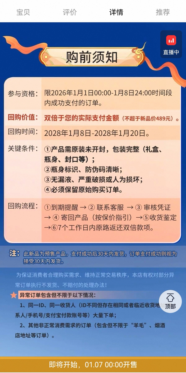 此外,产品页面也提示了需满足的关键条件包含四方面:1、产品需原装未开封,包装完整(礼盒、瓶身、封口等);2、瓶身标识、防伪码清晰;3、无漏液、严重破损或人为损坏;4、必须保留原始购买订单。页面还提示,此新品为预售产品,支付成功后30天内发货。