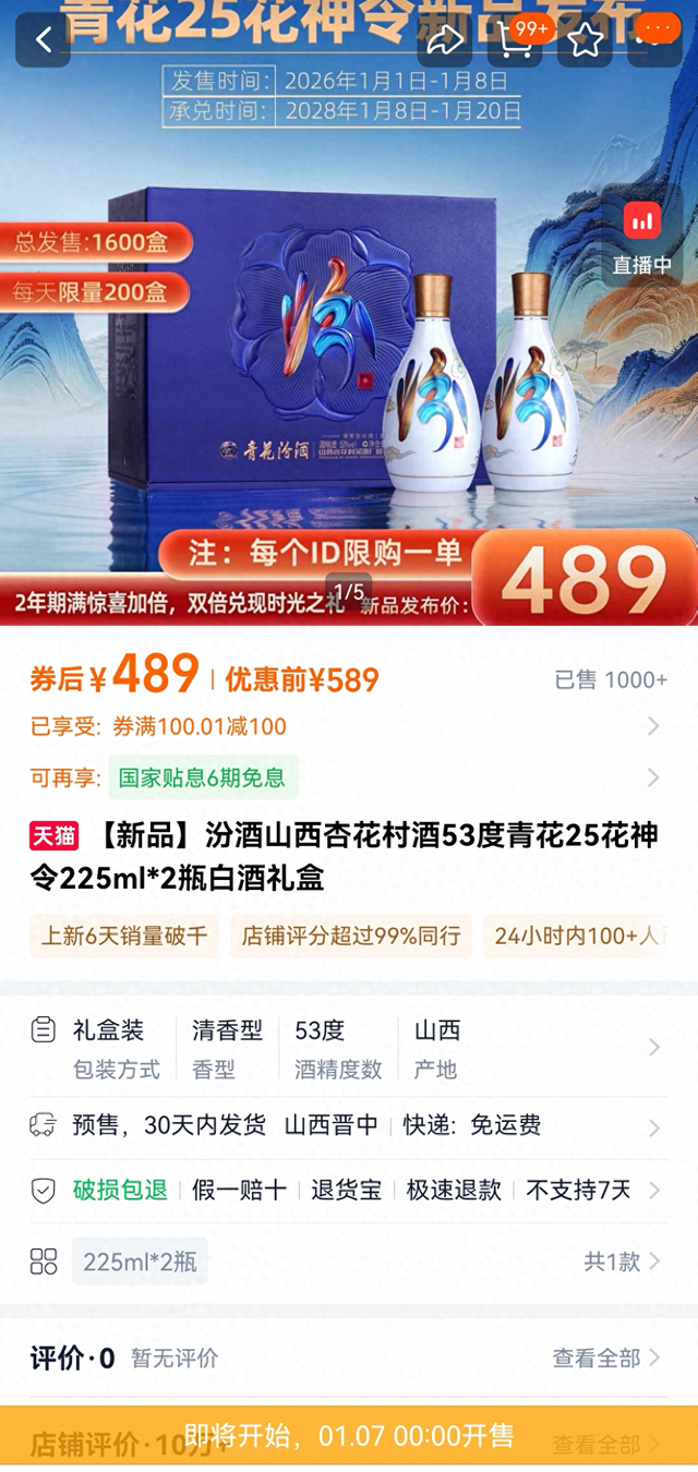 需要指出的是,1月6日下午,记者再次点开“青花25花神令”促销页面,这一活动再次上架,将于1月7日0:00开售。