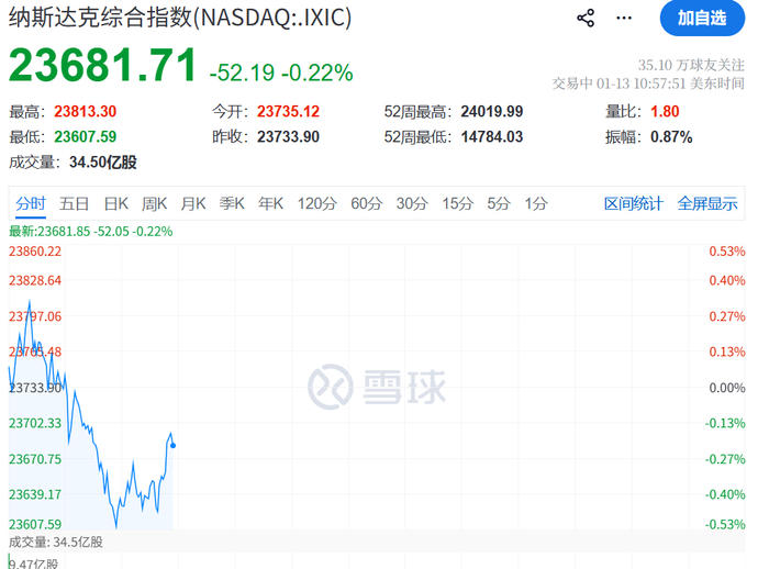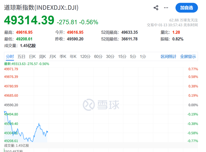 1月13日晚间,美股三大指数开盘之后,逐渐下跌。道指一度跌超300点,纳指跌约0.5%,市场避险情绪浓厚。