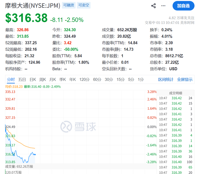 摩根大通股价近下跌3%,原因是投行业务手续费收入不及其自身指引,其中承销与并购顾问两块业务的收入均出现下滑。另外,摩根大通警告,特朗普提出将信用卡利率设定10%上限的主张,对其业务带来“重大调整”的风险,并将对这家美国最大银行及其客户带来伤害。