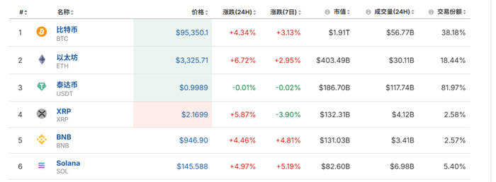 昨晚,虚拟币市场持续爆发,比特币今晨一度突破96500美元,以太坊触及3380美元。其他币种亦是集体爆发。