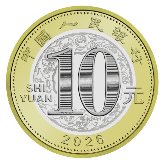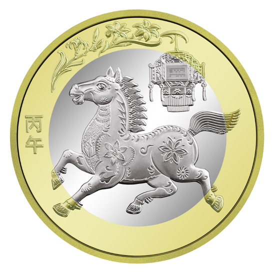 双色铜合金纪念币正面刊印“中国人民银行”“10元”等字样,底纹衬以团花图案;背面则将中国传统剪纸艺术与装饰年画元素相结合,塑造出灵动的马形象,辅以花灯、萱草图案点缀,币面左侧明确刊有“丙午”字样,呼应马年干支纪年。