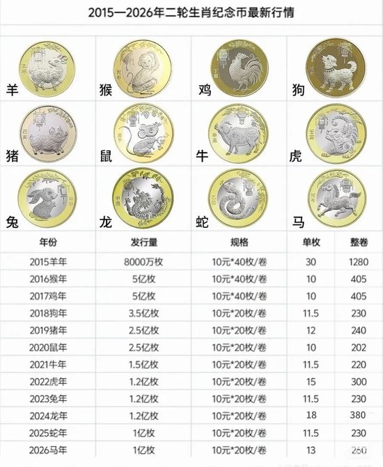 回顾生肖纪念币市场,第二轮生肖纪念币中,2015年羊年纪念币作为龙头品种,面值10元,发行量8000万枚,目前市场价格已达30元左右,涨幅约3倍;2021年牛年纪念币发行量减至1.5亿枚,当前市场价格在11元到14元左右;而2016年猴年、2017年鸡年纪念币因发行量高达5亿枚,市价基本维持面值,未出现明显溢价。