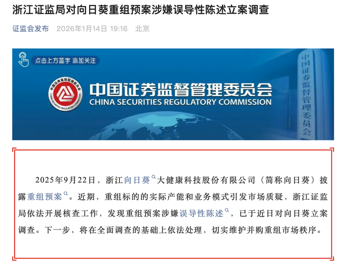 1月14日,据证监会网站消息,向日葵重组标的的实际产能和业务模式引发市场质疑,浙江证监局依法开展核查工作,发现重组预案涉嫌误导性陈述,已于近日对向日葵立案调查。下一步,将在全面调查的基础上依法处理,切实维护并购重组市场秩序。