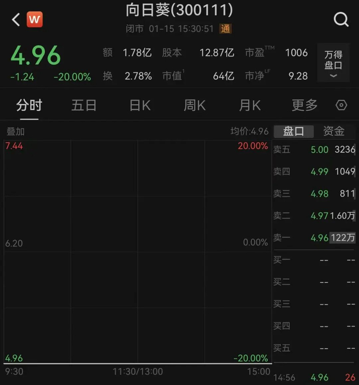 1月15日,受上述利空影响,向日葵开盘封20厘米一字跌停,卖一达122万手。《每日经济新闻》记者向向日葵方面表达了采访诉求,但截至发稿前未获回复。