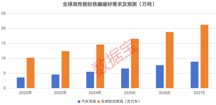 钕铁硼稀土永磁材料作为第三代永磁材料,是目前磁性能最好、综合性能最优的磁性材料。其中,新能源汽车是高性能钕铁硼材料需求拉动最明显的领域,未来需求占比约50%。中信建投表示,预计2026年全球新能源汽车产量将增长至超2600万辆,对应钕铁硼永磁材料需求量将达到6.6万吨,汽车领域对钕铁硼总需求量接近8万吨。与此同时,包括汽车以及工业电机、风力发电、工业机器人、人形机器人、节能电梯、变频空调、生活用品在内,2026年全球高性能钕铁硼需求量预计达到18.8万吨,较2022年10.2万吨的需求量有望增加超过80%。