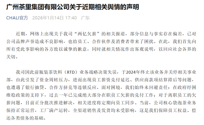 1月14日,茶里发文对网络上关于其“两亿欠薪”的相关传言进行澄清,同时承认,因为布局瓶装茶饮料的战略决策失误,公司资金确实有周转压力,并在2024年已经终止瓶装茶饮料业务。