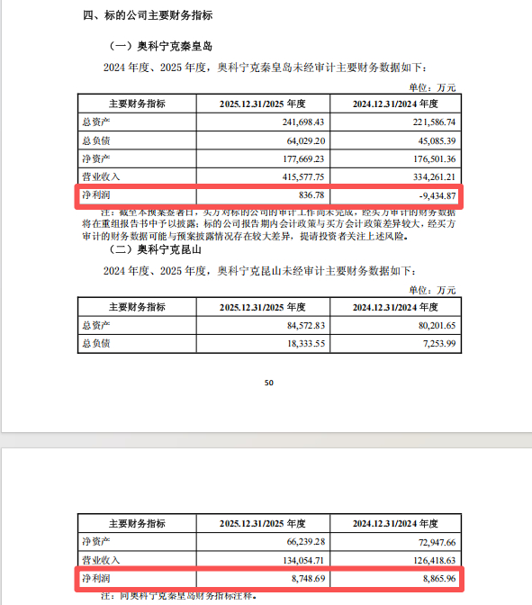 2024年、2025年,奥科宁克秦皇岛的净利润分别是-9434.87万元、836.78万元;奥科宁克昆山的净利润分别是8865.96万元、8748.69万元。