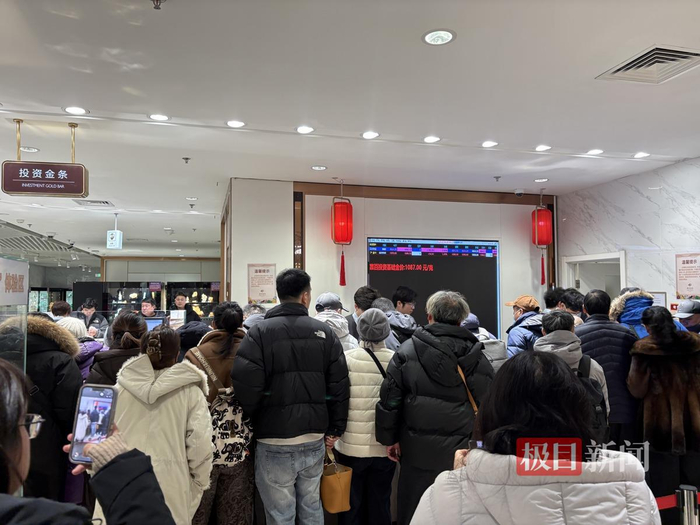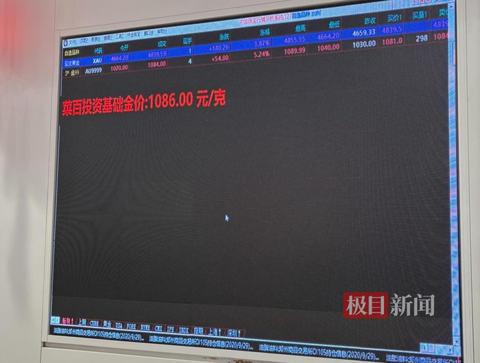 四楼黄金销售大厅同样人气火爆。显示屏上,实时金价在上午9时43分显示为1086元/克。金条柜台前挤满了消费者,工作人员不停从柜台里取出金条供选购,不少顾客爽快下单。