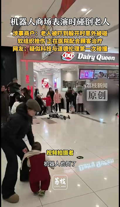 人形机器人商场表演意外碰到围观老人,双双倒地,涉事商户:老人被送往医院,软组织挫伤
