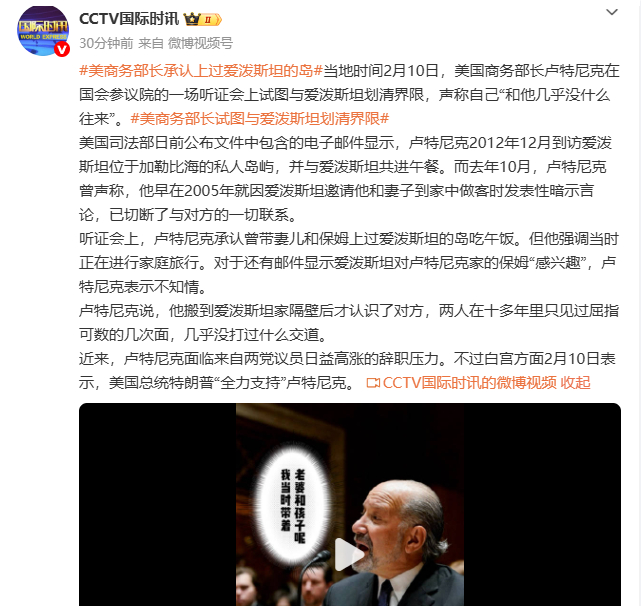 听证会上,卢特尼克承认曾带妻儿和保姆上过爱泼斯坦的岛吃午饭。但他强调当时正在进行家庭旅行。对于还有邮件显示爱泼斯坦对卢特尼克家的保姆“感兴趣”,卢特尼克表示不知情。
