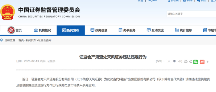 2月13日,证监会官网发布公告称,近日,证监会对天风证券股份有限公司(以下简称天风证券)为武汉当代科技产业集团股份有限公司(以下简称当代集团)涉嫌违法提供融资及信息披露违法违规行为作出行政处罚及市场禁入事先告知。