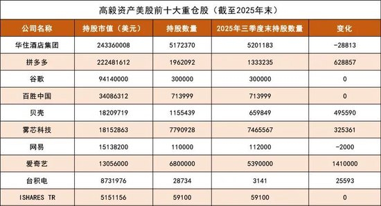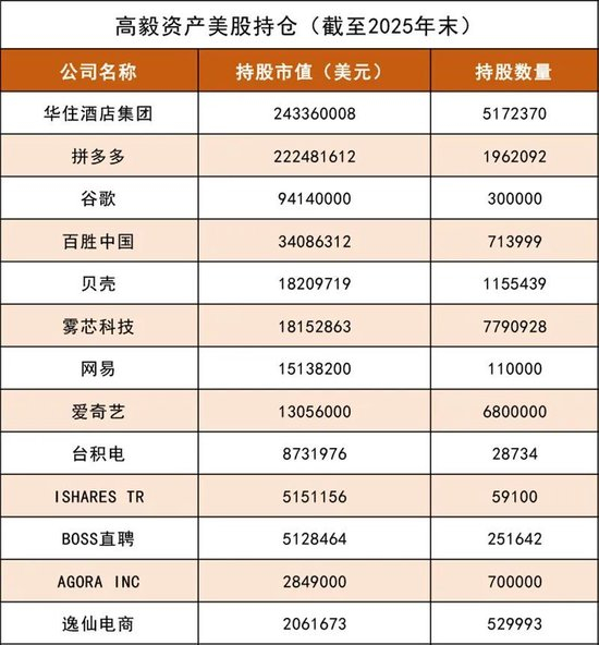 美国证券交易委员会公开资料显示,截至2025年末,高毅资产美股持仓的前十大重仓股分别为华住酒店集团、拼多多、谷歌、百胜中国、贝壳、雾芯科技、网易、爱奇艺、台积电和ISHARES TR,中概股占据主导地位。