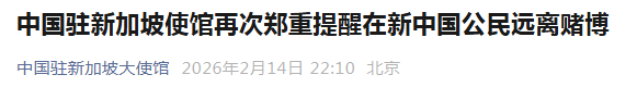 中国驻新加坡使馆再次郑重提醒在新中国公民远离赌博