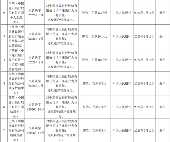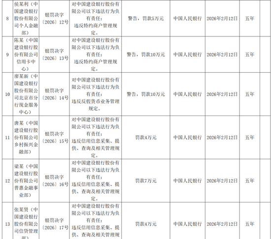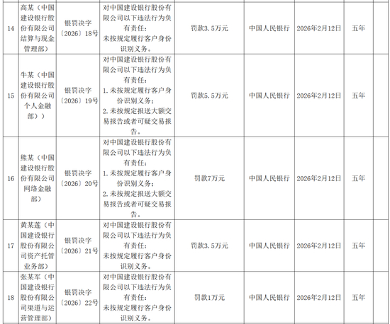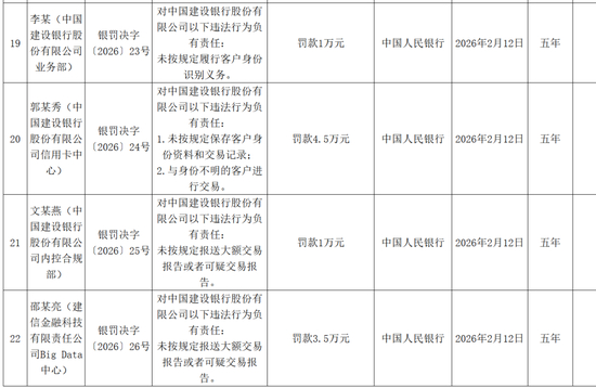 此外,21人因对建行违法行为负有责任,收到央行罚单。