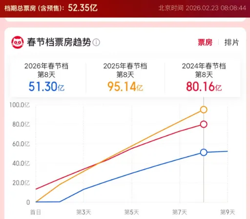 但需指出的是,据猫眼专业版,截至2月22日,2026年春节档总票房(含预售)为51.3亿元,明显低于前两年春节档的总票房。