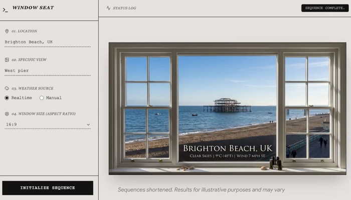 为了展现模型的这一功能,谷歌创建了一个名为“Window Seat”(靠窗座位)的程序进行演示,用户可以在这一程序上设定世界上任何一个地区,指定想要的窗户位置,让Nano Banana 2生成一扇窗户的逼真画面,并根据实时天气数据更新景色。