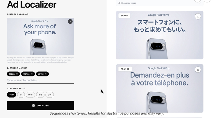 为了展示这些功能,谷歌开发了一款名为“全球广告本地化器”(Global Ad Localizer)的演示应用,它可以将一个英语版本的图像广告翻译成不同语言,例如日文、法语等,以适应国际市场,这对出海的企业来说有应用价值。
