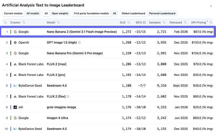 AI基准测试机构Artificial Analysis今天发文提到,Nano Banana 2以Nano Banana Pro的一半的价格在文生图榜单中排名第一,在图像编辑榜单中排名第三,仅次于GPT Image 1.5和Nano Banana Pro。