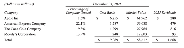 此外,伯克希尔的财报还显示,截至2025年12月31日,其权益投资的总公允价值65%集中在美国运通、苹果、美国银行、可口可乐公司和雪佛龙。
