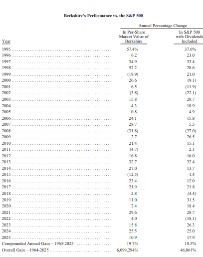 虽然巴菲特的收官数据并不完美,但在巴菲特掌舵伯克希尔的1965年至2025年,财报数据显示,伯克希尔的复合年增长率为19.7%,远超标普500的10.5%。此外,1964年至2025年的61年时间里,伯克希尔的整体涨幅达6099294%,而标普500指数包括股息在内的涨幅仅为46061%。