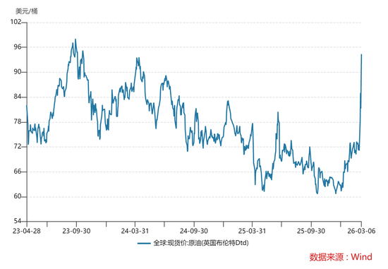 2026年3月6日,原油(英国布伦特Dtd)价格上涨至94.35美元/桶,逼近前期高点。最直接的催化就是中东战火再起,作为全球能源运输体系中核心咽喉通道的霍尔木兹海峡被封航,甚至伊拉克和科威特受出口限制,被迫减产。
