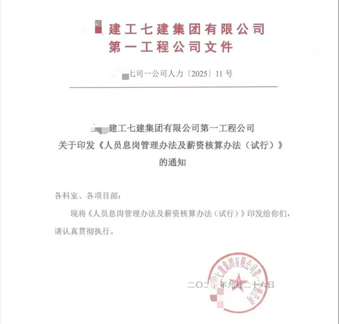 江苏有家建设集团发布的通知里,出现了“息岗”这一表述。其实,“息岗”并非该集团首创,早在2025年,上海某建工旗下的一家公司就出台过《人员息岗管理办法》。用通俗易懂的话来讲,“息岗”就是员工没工作任务时先回家待着,工作岗位会保留,但工资会降低。
